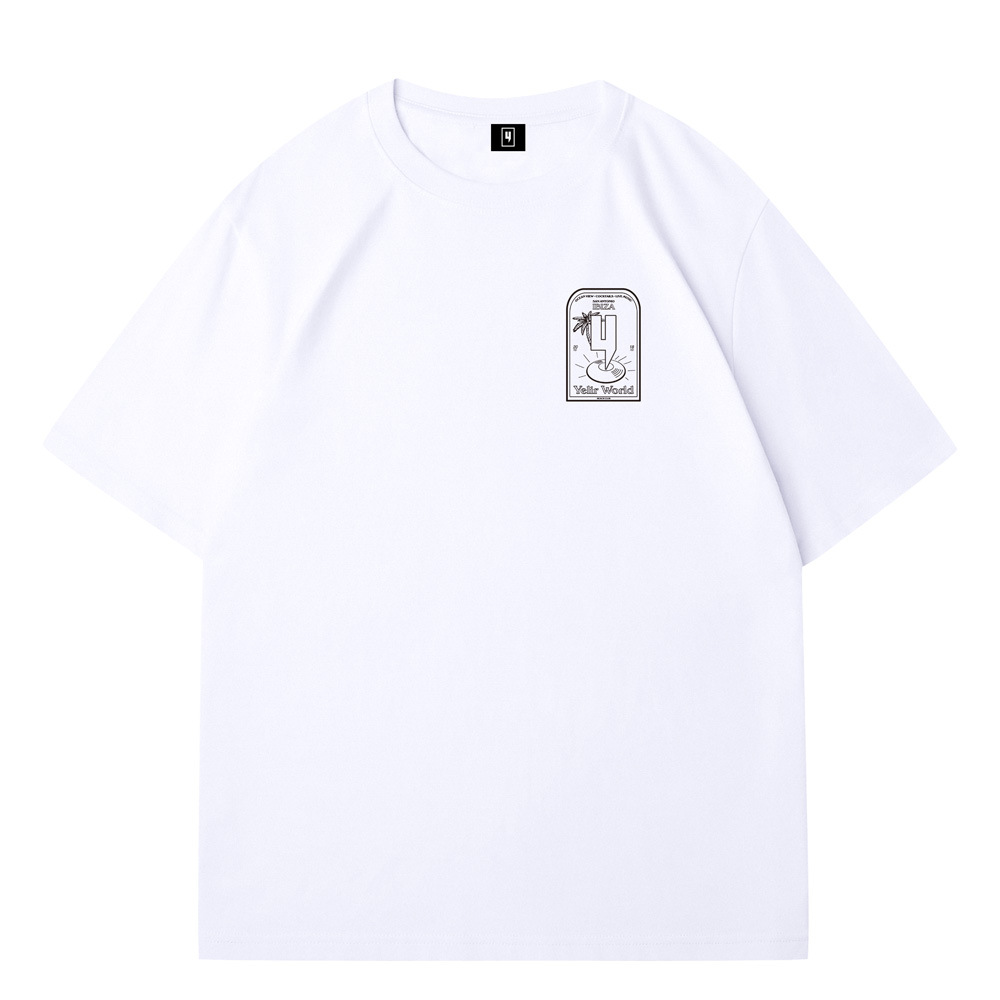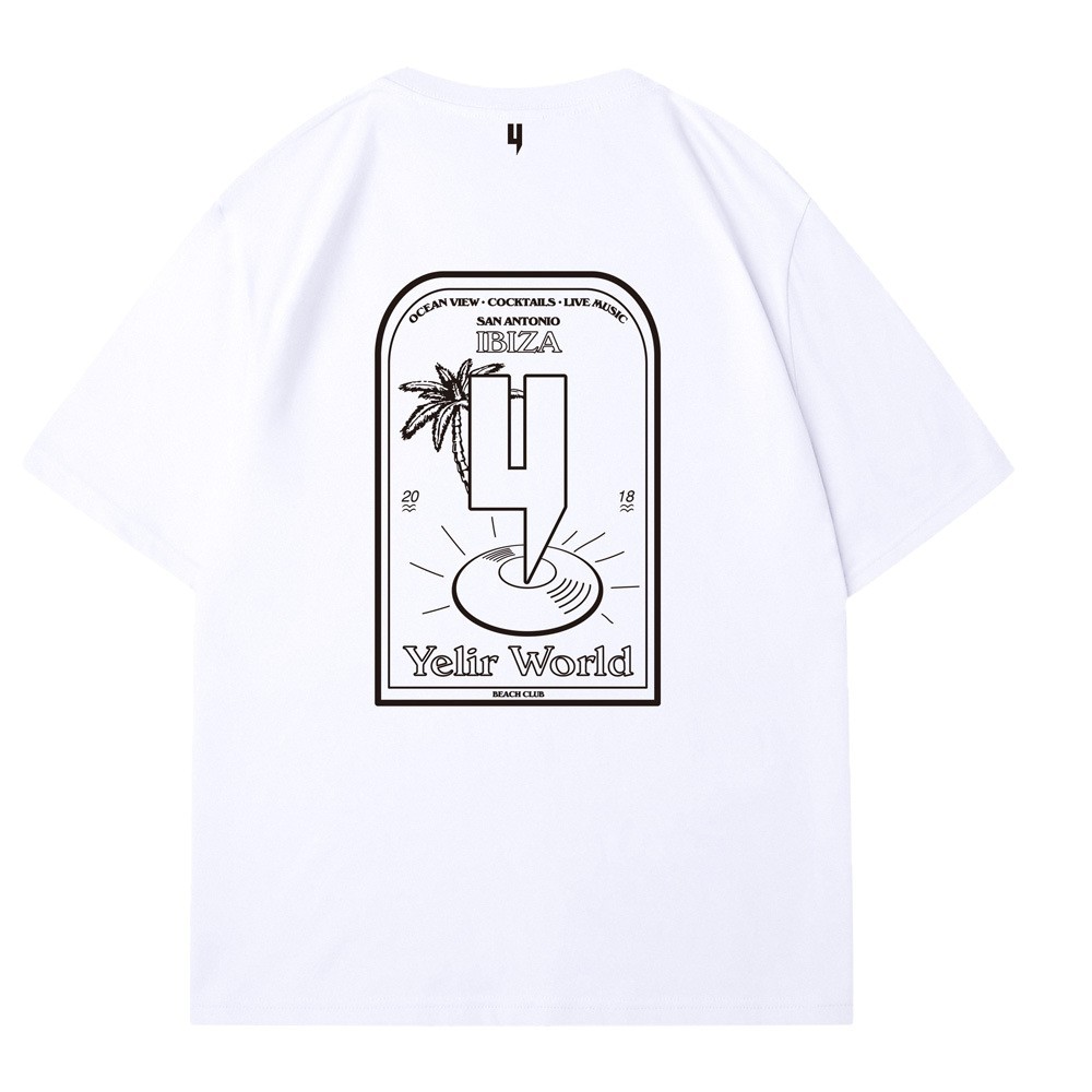 This short-sleeve T-shirt is inspired by the Ibiza Beach Club, featuring a retro vintage black-and-white line art style. The back is printed with the iconic "4" graphic, palm tree and vinyl record elements, paired with slogans like "OCEAN VIEW·COCKTAILS·LIVE MUSIC", "SAN ANTONIO IBIZA" and "Yelir World BEACH CLUB", conveying a laid-back and casual seaside vacation vibe.