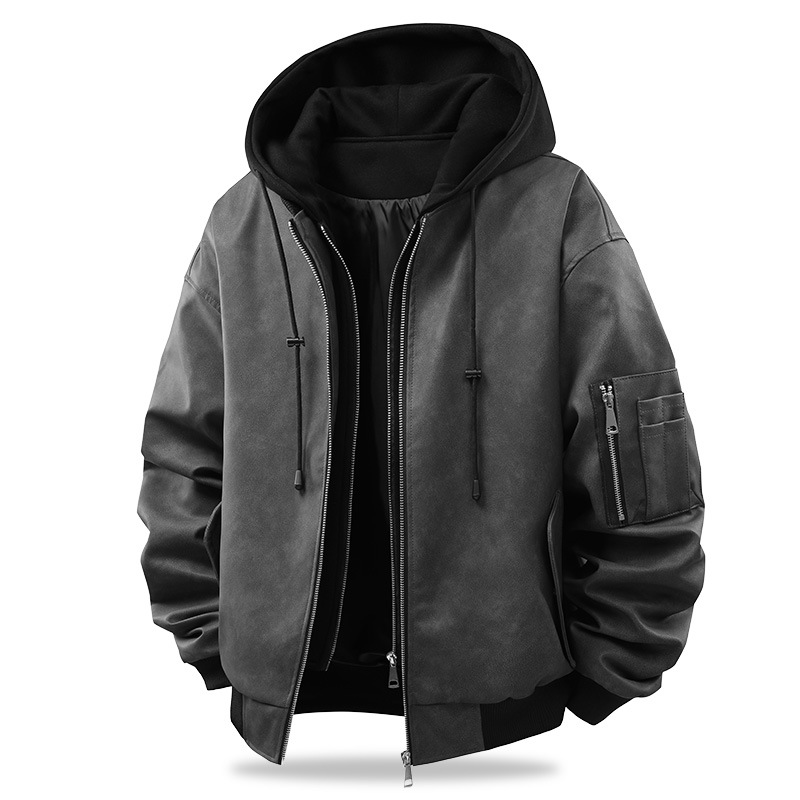 This jacket features a two-in-one design: the outer layer is made of fine-textured PU leather with a subtle sheen, while the inner layer is a black hooded sweatshirt, combining warmth and layering for a 3D visual effect. The classic bomber jacket silhouette is paired with a metal zipper placket, and a functional zipper pocket on the left sleeve retains motorcycle workwear details.