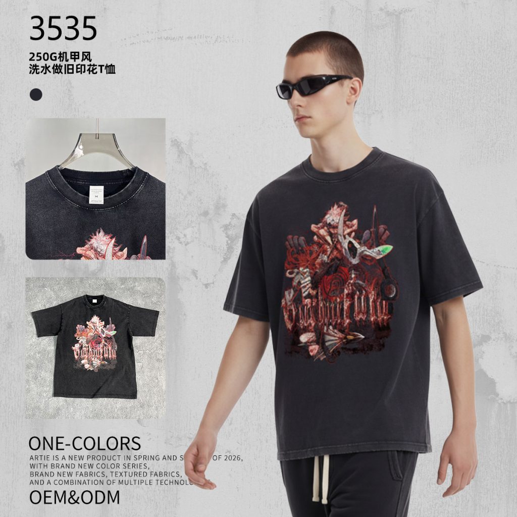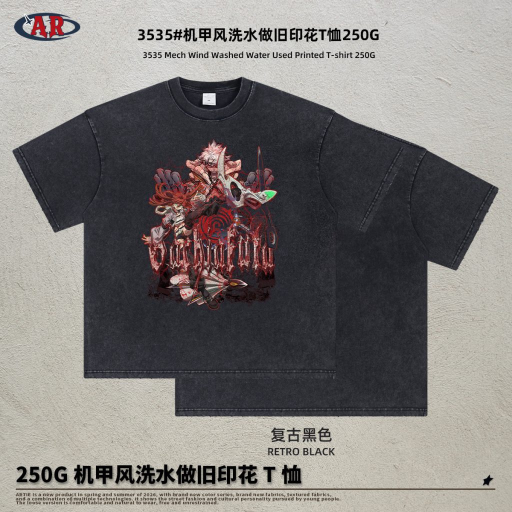 This American high street short-sleeve T-shirt adopts heavyweight vintage washing process, presenting a retro washed black texture. The fabric is thick and crisp, with retro washed texture and frayed details, full of street style. The front is printed with dark anime characters and Gothic font, which has strong visual impact and is full of two-dimensional and subcultural trendy sense. The dropped-shoulder oversized silhouette is highly inclusive for all body types, lazy and casual to wear, suitable for streetwear, trendy outfits, anime conventions and other scenarios, making it a highly personalized trendy item.