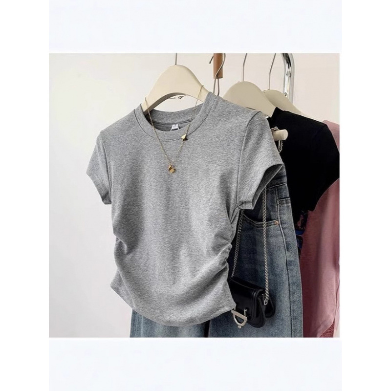 This T-shirt is made of soft and skin-friendly cotton blend fabric, which is breathable, comfortable and moderately elastic, offering unrestricted daily wear. The classic crew neck design is simple and versatile, flattering the neckline. The side ruched design cleverly cinches the waist, optimizing body proportions for a slimmer and sharper look. The curved hem adds a sense of detail and layering. The solid color design is minimalist and elegant, and can be matched with jeans, skirts, casual pants and other bottoms, making it a basic and versatile item for daily commuting and casual outings in spring and summer.