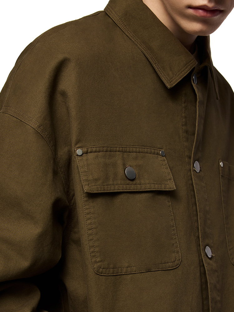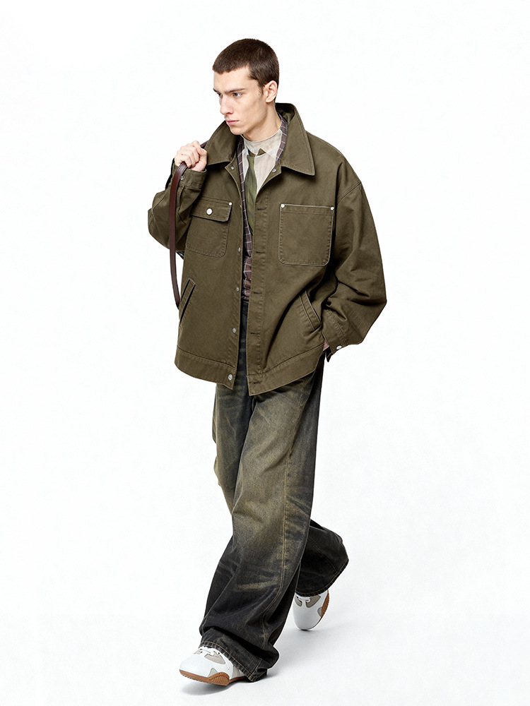 Made of heavyweight twill cotton, it is structured, durable, and resistant to deformation, with a fine matte finish. The loose dropped-shoulder fit is inclusive to various body types, with a hip-length cut that pairs well with jeans or casual pants, ideal for spring/autumn daily streetwear, vintage outfits, or light workwear looks.